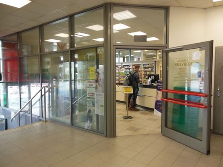 Hlavní vstupní dveře lékárny jsou dvoukřídlé (šířka 2x 106 cm) a otevírají se mechanicky směrem ven. V zádveří je schodiště (+ 8 schodů). Vedlejší vchod umožňující bezbariérový přístup je dispozici vpravo. Pro kompenzaci schodiště (+ 8 schodů) je před vedlejším vstupem k dispozici čtyřramenná zalomená rampa (1 - 3 . úsek sklon 5 %, šířka 141 cm, délka 500 cm, 4. úsek sklon 9 %, šířka 141 cm, délka 450 cm) s vyhovujícími podestami. Rampa je opatřena drsným povrchem a oboustranným madlem (výška 102 cm). Manipulační prostor nad rampou je dostatečný. Jednokřídlé dveře vstupu do lékárny se otevírají automaticky do strany. Šířka průjezdu je zúžená (šířka 76 cm). Z prostorného zádveří vedou do lékárny jednokřídlé dveře (šířka 107 cm), otevírají se mechanicky směrem dovnitř.