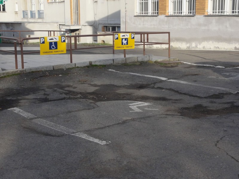 Jedno vyhrazené kolmé parkovací stání pro osoby s omezenou schopností pohybu je umístěno u pavilonu P. U stání je asfaltový povrch s velkými nerovnostmi.