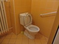 Upravená, přesto nepřístupná toaleta (dveře šířka 70 cm; kabina šířka 181 cm, hloubka 122 cm), z důvodu nedostatečných rozměrů, se nachází v přízemí v oddělení WC ženy. Jednokřídlé dveře do WC nejsou označené a otevírají se mechanicky do strany. Přístup k míse je zleva. Prostor pro vozík vedle WC mísy je dostatečný (šířka 83 cm). Toaletní mísa je vybavena pouze jedním pevným madlem na straně u zdi. Sklopné madlo na straně u volného manipulačního prostoru chybí.